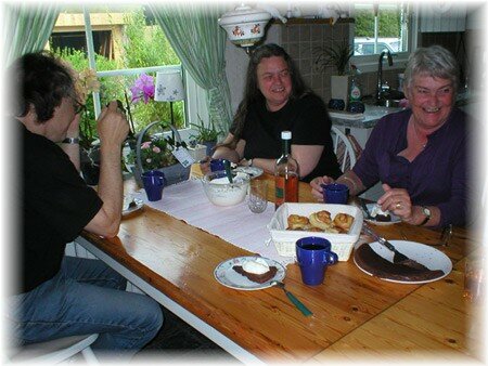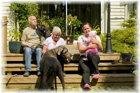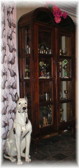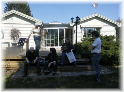Visserligen hade vi Grand Danois även tidigare, men kennelnamnet fick vi först 1.4.1984 och då kom kennelverksamheten igång på allvar. 25 år med Grand Danoisuppfödning är något stort. Därför bjöd vi in till ”Öppet hus” under en hel vecka och det var glädjande att se att så många av våra valpköpare och övriga vänner tittade in. Det blev mycket hundsnack, gamla videofilmer, ännu äldre minnen, kaffe och kakor och lite annat….En del av den inre kärnan besökte oss redan tidigare. Titta på bilden här bredvid. Alla dessa personer är fortfarande, även efter 25 år, knuten till Boarhuntergänget. Det är vi verkligen stolt och glad över! Dessa ”gamla” valpköpare har varit hörnstenar i vår kennel och de är det faktiskt även idag!