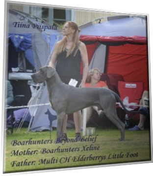 "Benzon", dvs. Boarhunters Beyond Belief och hans ägare Tiina Pekkala har varit mycket aktiva i utställningsringarna. Här är några resultat från 2013 fram till dagens datum.