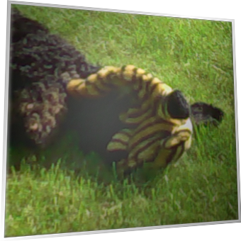 Bonnie fick besök av våra vänner Ulla och Johanna efter hundutställningen i Hässleholm. De hade många trevliga presenter med sig. Här testar hon om tigern var bettvänlig...