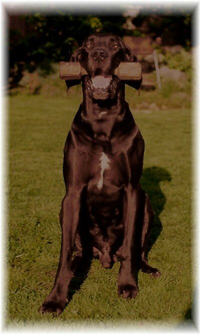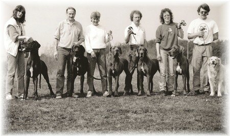 Efter återkomstenvar hon helt till sig! Vilken hund! Hon hade aldrig sett en så lättlärd och följsam hund i hela sitt liv. Lenas uttalande medförde en omedelbar anmälan till LBK’s valpkurs och senare fortsättningskurser, speciellt när jag fick reda på att Boarhunters Hurricane hade erövrad sitt LP. Vi bildade en lydnadsgrupp för Grand Danois. Ulla Olsson och Gina, jag med Ivanhoe, Christina med Farrah, våra delägare Per-Inge Persson med Heloise, Marina Persson med Estella och Pär Franze’n med instruktörshunden Minus.
